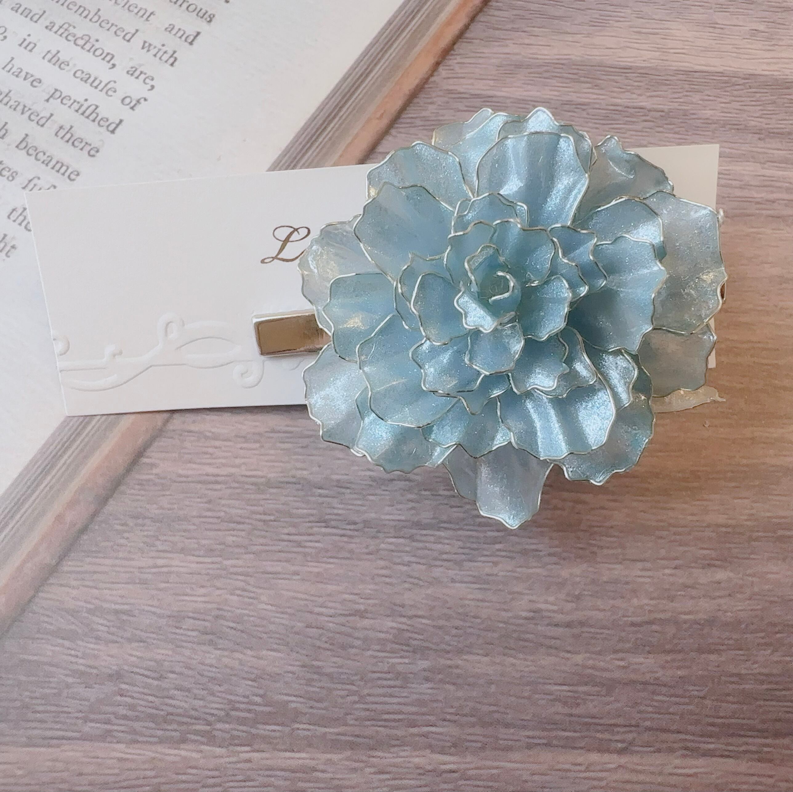 8段合わせて39枚のフリルたっぷりの花びらのブルーのヘアクリップは、8段合わせて合計39枚花びらが優雅に広がるデザインです。