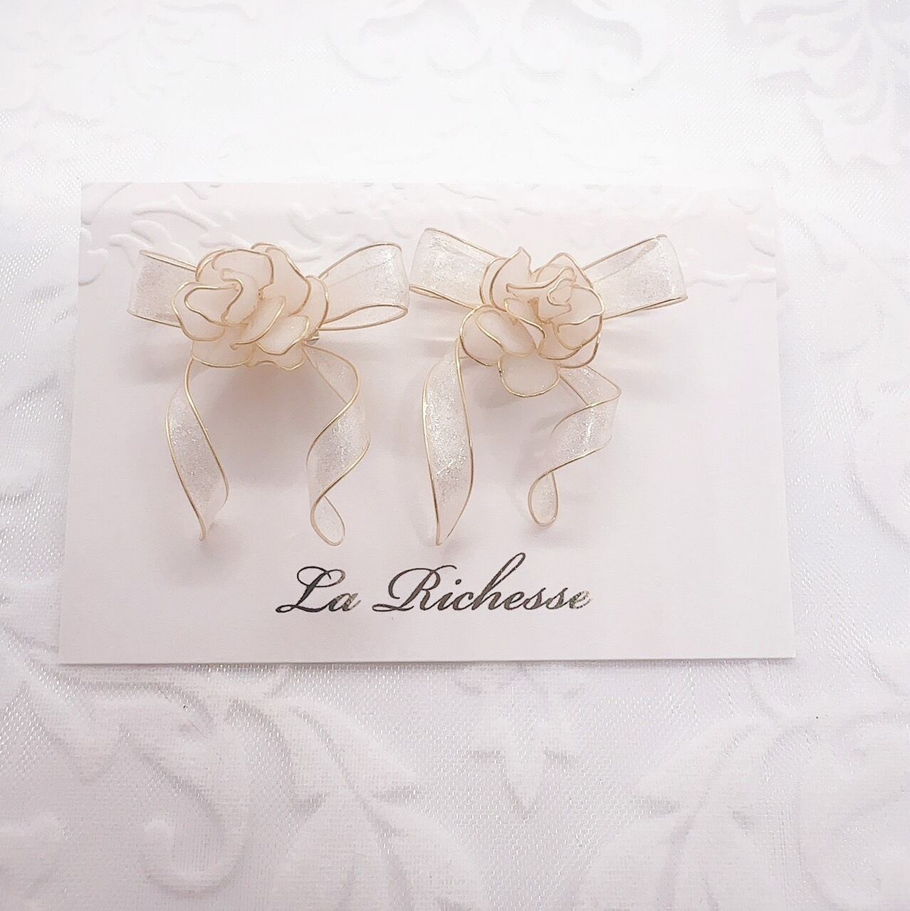 ディップフラワーの薔薇とリボンを組み合わせたデザインのピアスです。