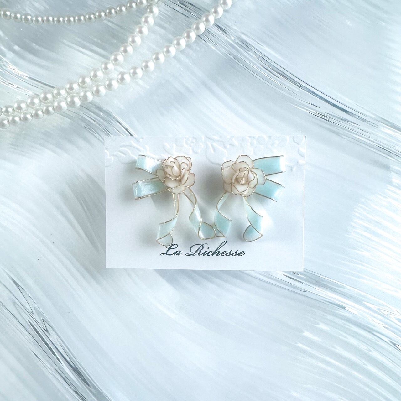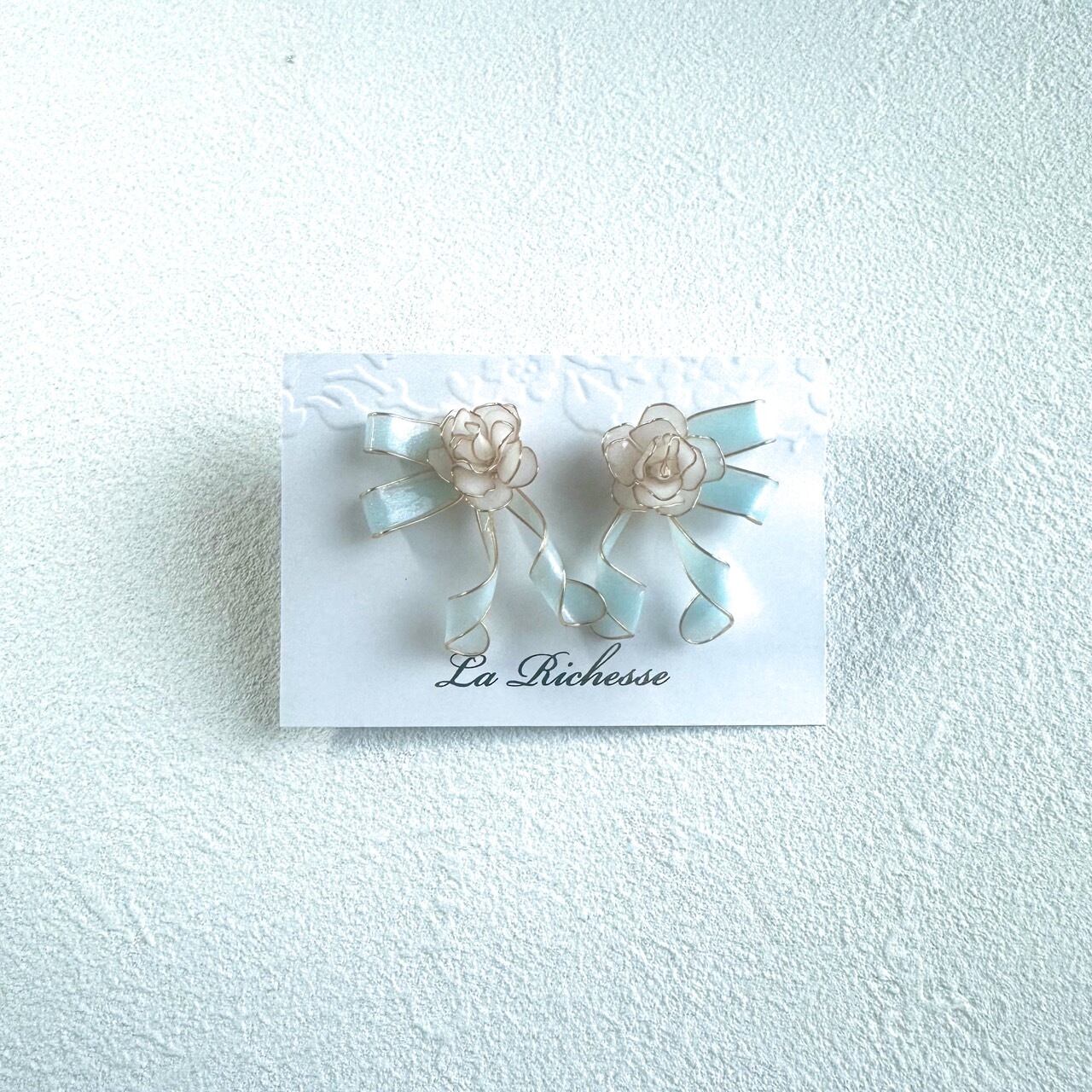 ディップフラワーの薔薇とリボンを組み合わせたデザインのピアスです。